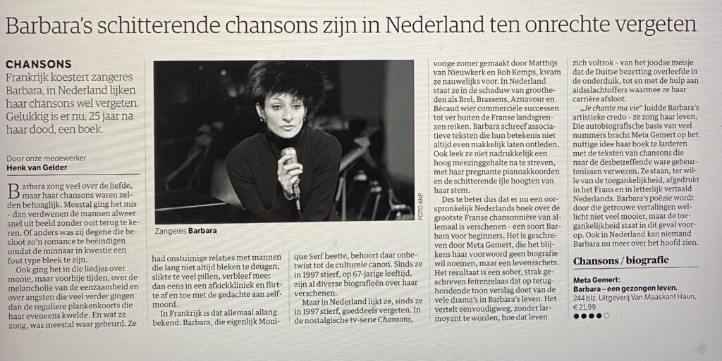Op 24 november 2022 was het 25 jaar geleden dat de chansonnière Barbara (1930-1997) – geboren als Monique Andrée Serf – overleed. Er zijn veel artiesten en kunstenaars van wie wordt gezegd dat ze onvergetelijk zijn, maar Barbara was wat dat betreft het summum: in Frankrijk was ze een waar icoon met de status van een rockster. Haar optredens werden gaandeweg steeds meer een spirituele belevenis. De meerderheid van haar toehoorders was relatief jong, tussen de 17 en 35 jaar, en als haar stem het tijdens een concert even liet afweten, zong dat publiek zelf luidkeels de chansons met haar mee. ‘J’aime les journalistes, mais je déteste les questions’ is een geestige maar gemeende uitspraak van haar. Ze had een moeilijke jeugd, waardoor elke vraag die iets diepgravender was een geërgerde reactie opwekte. Zij zóng haar leven (‘Je chante ma vie’) en ze wilde dus het liefst alleen vertellen over haar werk.
